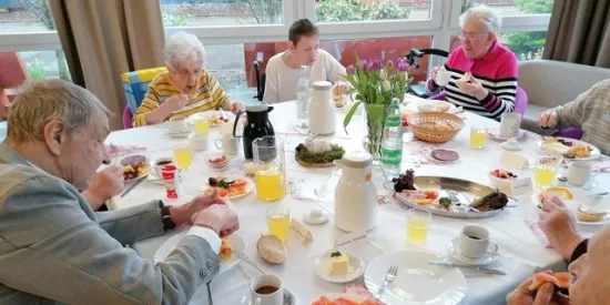 In unserer hauseigenen Küche werden die täglichen Mahlzeiten frisch zubereitet: Vom Frühstück über Zwischenmahlzeit, Mittagessen und Kaffeezeit bis hin zum Abendessen und dem auf Wunsch servierten spät abendlichen Snack. Auch Diät- oder Schonkost bieten wir Ihnen selbstverständlich gerne an – so kann es sich jede und jeder bei uns schmecken lassen. Das abwechslungsreiche Verpflegungskonzept ist angepasst an die aktuellen Empfehlungen der Deutschen Gesellschaft für Ernährung e.V. (DGE). Auch regionale Spezialitäten sowie die Wünsche der Bewohnerinnen und Bewohner werden dabei natürlich berücksichtigt. Getränke wie Kaffee, Kakao, Tee, Wasser und verschiedene Fruchtgetränke stehen stets zur Verfügung. Private Feiern der Bewohnerinnen und Bewohner sind ebenfalls möglich – wir helfen gerne bei der Vorbereitung.