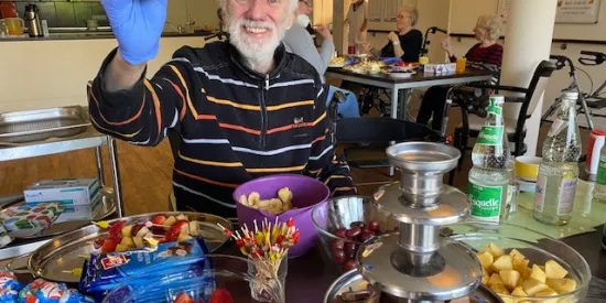 Teil des gelebten Alltags einer Großfamilie ist es auch, sich einzubringen und zu merken, dass man in der Gemeinschaft gebraucht wird. Hauswirtschaftliche Tätigkeiten sind daher, je nach Interessen und Fähigkeiten, feste Bestandteile des Aktiv-Programms für unsere Bewohnerinnen und Bewohner. Ob Kartoffeln schälen, Kuchenteig kneten, Wäsche falten oder Blumen in einer Vase arrangieren: Viele erlernte Kompetenzen sind präsent. Täglich wird so die persönliche Eigenständigkeit praktiziert.