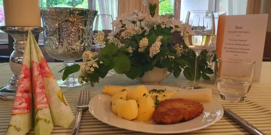 In unserer hauseigenen Küche werden die täglichen Mahlzeiten frisch zubereitet: Vom Frühstück über Zwischenmahlzeit, Mittagessen und Kaffeezeit bis hin zum Abendessen und dem auf Wunsch servierten spät abendlichen Snack. Auch Diät- oder Schonkost bieten wir Ihnen selbstverständlich gerne an – so kann es sich jede und jeder bei uns schmecken lassen. Das abwechslungsreiche Verpflegungskonzept ist angepasst an die aktuellen Empfehlungen der Deutschen Gesellschaft für Ernährung e.V. (DGE). Auch regionale Spezialitäten sowie die Wünsche der Bewohnerinnen und Bewohner werden dabei natürlich berücksichtigt. Getränke wie Kaffee, Kakao, Tee, Wasser und verschiedene Fruchtgetränke stehen stets zur Verfügung. Private Feiern der Bewohnerinnen und Bewohner sind ebenfalls möglich – wir helfen gerne bei der Vorbereitung.