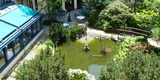 Die DOREAFAMILIE Braunschweig – Wohnpark am Wall liegt direkt am Braunschweiger Grüngürtel, der die historische Altstadt der „Löwenstadt“ umschließt. Über das elegante Park- und Gartengelände führt die Eulenspiegeltwete, beliebter Rad- und Fußweg, dem man direkt ins Stadtzentrum folgen kann. Wenn die Japanischen Zierkirschen blühen, beobachten wir oft Hochzeitspaare vor dieser wunderschönen Kulisse. Der Japanische Garten mit kunstvoll gestalteten Teichen, in denen Kois schwimmen, mit geschwungene Holzbrücken, Wasserfällen und bequemen Sitzplätzen unter Sonnenschirmen sowie einem Pavillon ist eines der vielen attraktiven Merkmale unseres Hauses. Vom Restaurant mit seinem gemütlichen Wintergarten aus genauso wie von vielen Balkonen und Terrassen genießen die Bewohnerinnen und Bewohner einen herrlichen Blick auf die Pflanzen- und Wasserwelt. Alle Wege sind seniorengerecht gestaltet. Sie sind eine beliebte Möglichkeit für kurze Rundgänge an der frischen Luft.