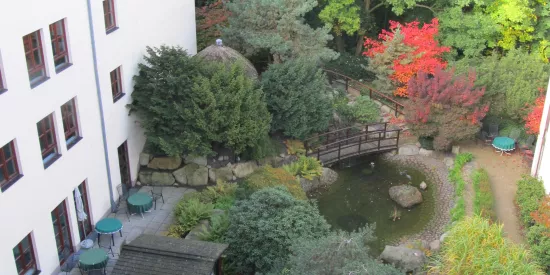 Die DOREAFAMILIE Braunschweig – Wohnpark am Wall liegt direkt am Braunschweiger Grüngürtel, der die historische Altstadt der „Löwenstadt“ umschließt. Über das elegante Park- und Gartengelände führt die Eulenspiegeltwete, beliebter Rad- und Fußweg, dem man direkt ins Stadtzentrum folgen kann. Wenn die Japanischen Zierkirschen blühen, beobachten wir oft Hochzeitspaare vor dieser wunderschönen Kulisse. Der Japanische Garten mit kunstvoll gestalteten Teichen, in denen Kois schwimmen, mit geschwungene Holzbrücken, Wasserfällen und bequemen Sitzplätzen unter Sonnenschirmen sowie einem Pavillon ist eines der vielen attraktiven Merkmale unseres Hauses. Vom Restaurant mit seinem gemütlichen Wintergarten aus genauso wie von vielen Balkonen und Terrassen genießen die Bewohnerinnen und Bewohner einen herrlichen Blick auf die Pflanzen- und Wasserwelt. Alle Wege sind seniorengerecht gestaltet. Sie sind eine beliebte Möglichkeit für kurze Rundgänge an der frischen Luft.