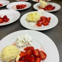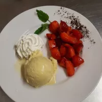Zum Dessert gab es Vanilleeis an frischen Erdbeeren mit Sahne verfeinert.