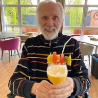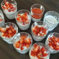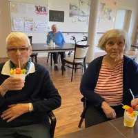 Heute gab es für alle Bewohner und Mitarbeiter Quark mit Erdbeeren als Zwischenmahlzeit vor dem Mittagessen und Orangensaft mit Vanilleeis und Früchtespieße (Melone, Ananas, Mango, Orange und Kiwi) zum Nachmittag.