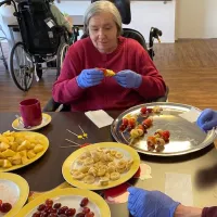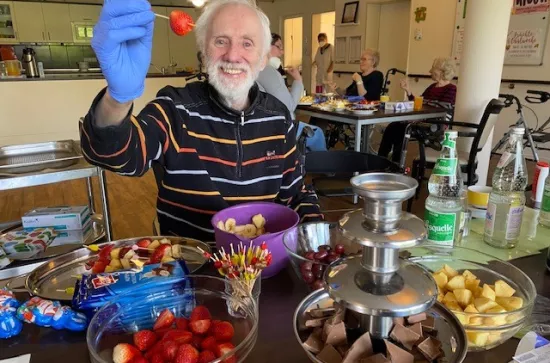 TAG 4 - OBST MIT SCHOKOLADE Trotz dass der Schokobrunnen nicht so lief wie wir wollten und zwischendurch schon einige Früchte aufgegessen wurden, waren all unsere Bewohner vom Endergebnis begeistert. Der Spaß mit den Bewohnern von Wohnbereich 1 kam nicht zu kurz ... Zurück
