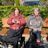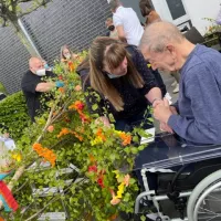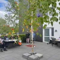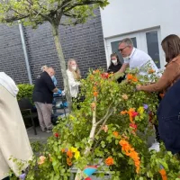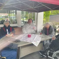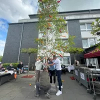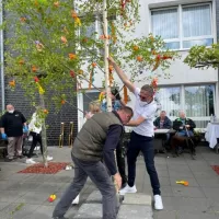 Um 10:00 Uhr trafen sich die Bewohner des Hauses, Angehörige und Mitarbeiter ganz ungezwungen zum Aufstellen des Maibaums auf der Terrasse des Cafés.