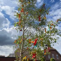 Trotz ständigem Kommen und Gehen war immer eine Grundanzahl von trinkfesten Feierleuten anwesend, die gemeinsam den Maibaum geschmückt, aufgestellt und geprostet haben.