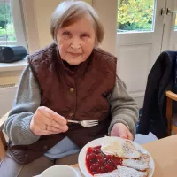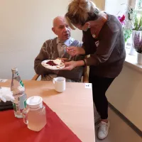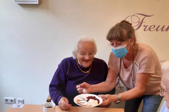 Waffeln backen im Gemeinschaftsraum Der Duft nach frisch gebackenen Waffeln zog durchs Haus und erinnerte manch einen an seine Kindheit. Serviert wurde diese Köstlichkeit natürlich mit Eis und heißen Kirschen. Unsere Bewohner ließen es sich schmecken. Zurück