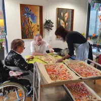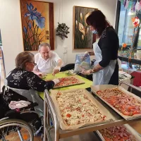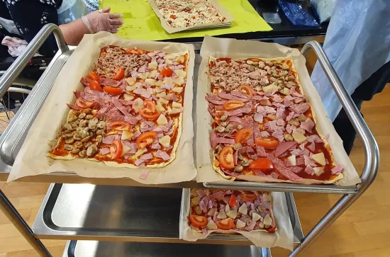 Auf Wunsch der Bewohner stand am Freitag Nachmittag "Pizza backen" auf dem Beschäftigungsplan. Gemeinsam wurde der teig ausgerollt, mit verschiedenen Zutaten belegt und anschließend mit ordentlich Käse bestreut.