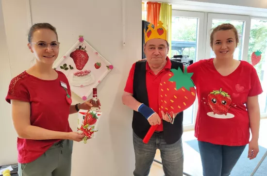 Nach dem Kaffeetrinken konnten die Bewohner ihr Wissen "Rund um die rote Frucht" unter Beweis stellen. In einem spannenden Duell gewann Herr A. mit einem Punkt Vorsprung das Erdbeerquiz und wurde zum "Erdbeerkönig 2023" gekrönt.