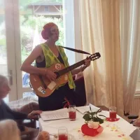 Als der Nachmittag fortschritt wurden altbekannte Lieder gesungen, die die Meisten ohne einen Blick ins Gesangbuch mit viel Freude mitsingen konnten. Zu den Liedern wurde ab und an geklatscht und geschunkelt. Die ausgelassene und fröhliche Stimmung erfasste alle Gäste und so wurden zur Erfrischung Erdbeerbowle, Säfte und Mineralwasser gereicht.