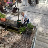Mit viel Tatkraft reinigten wir gemeinsam mit Einrichtungsleiterin Nicole Schulz den Teich, entfernten Laub und säuberten die Pumpen. Eine Mitarbeiterin ging besonders mutig voran: In geliehener Anglerhose stieg sie direkt in den Teich, um selbst die verstecktesten Winkel zu säubern. Neugierig beobachteten uns die Goldfische und ein kleiner Teichfrosch – als wollten sie sich bedanken.
