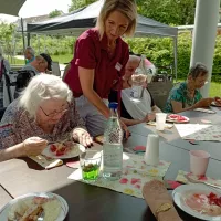 Nachdem am Morgen unsere fleißigen Helferlein frei nach dem Motto, die guten ins Töpfchen und die schlechten ins Kröpfchen eine Erdbeerlese vollzogen fabelhafte Erdbeerkuchen gezaubert haben, konnten wir am Nachmittag mit dem Genießen starten.