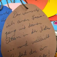 Für die Kita haben sich unsere Bewohner dieses mal etwas Besonderes einfallen lassen. Sie schnitten zum Einen fleißig Ostereier aus und zum Anderen beschrieben sie diese Eier mit Wünschen für die Kinder. Dabei kamen ganz liebenswerte Wünsche raus. Frau Bonigutt und ich überbrachten die Geschenke dann an Kita und Eulen Apotheke.