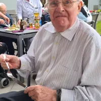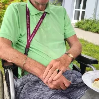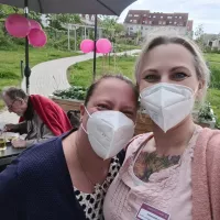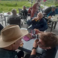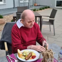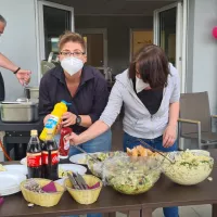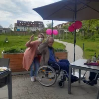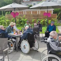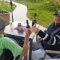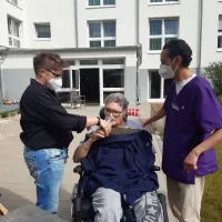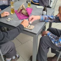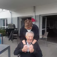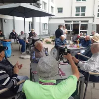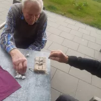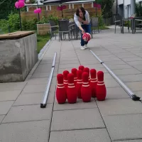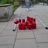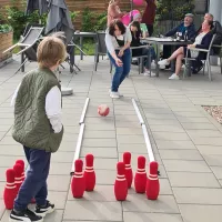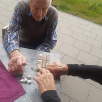 natürlich haben wir auch diesen Tag würdig mit unseren Männern gefeiert. Nachdem ich wie ein aufgescheuchtes Huhn durch die Gegend gerannt bin (ich dachte jeden Moment kommt der angekündigte Regen) und die Chefin mich dann in Senkel gestellt hat (liebevoll versteht sich), feierten wir feuchtfröhlich. Ohne Regen, nur hier und da ein zwei Tropfen. Als kleines Geschenk gab es ein selbstgemachtes Spiel *Tic tac toe*. Ein paar der Männer spielen auch direkt los. Quasi ein Spiel, welches in jede Hosentasche passt. Gekegelt haben mehr wir Mitarbeiter, aber sowohl die Bewohner hatten ihren Spaß als auch wir. Wir freuen uns schon jetzt auf die nächste Gelegenheit zu feiern.