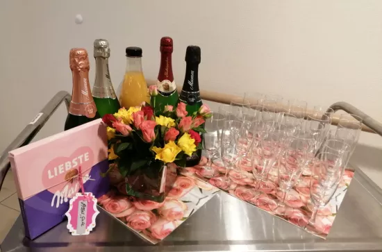 Begonnen mit einem kleinen Sektfrühstück, weitergeführt mit Pralinenpräsenten und einen krönenden Abschluss im Kaffee Kunterbunt e.V. konnten es sich alle Mütter- wir haben beide Augen für alle nicht-Mütter zugedrückt- einen Tag lang verwöhnen lassen.