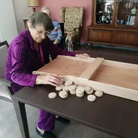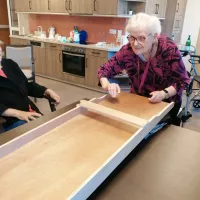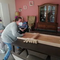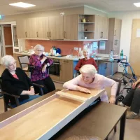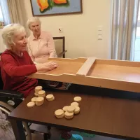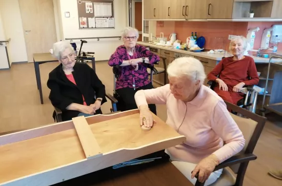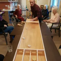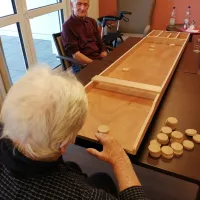 Das Shuffleboard kommt im Haus regelmäßig zum Einsatz und erfreut sich jedes Mal großer Beliebtheit. Es wird auf Tische gelegt, damit auch Rollstuhlfahrer teilnehmen können.
