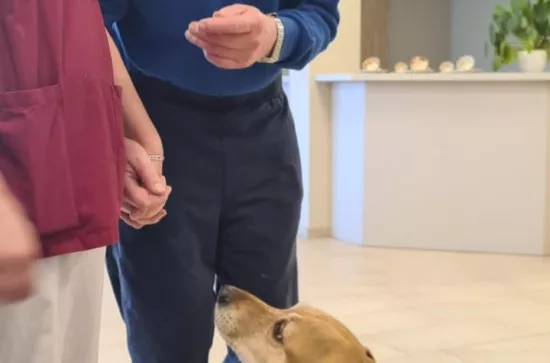 Unser Haushund war mal wieder zu Besuch und erfreute unsere Bewohner. Müde Augen werden wach, hängende Mundwinkel verziehen sich nach oben. Tiere wecken positive und angenehme Gefühle in uns Menschen und das merkt man auch an unseren Bewohnern. Unschwer auf dem Foto zu erkennen. :)
