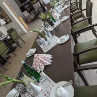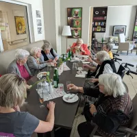 Nachmittags wurden bei Kaffee ,Kuchen und guter Musik die Bewohnerinnen in die Begegnungsstätte eingeladen. Auch diese erhielten ein Blümchen ihrer Wahl.
