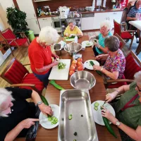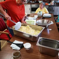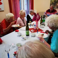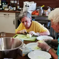 Gemeinsam mit unseren Bewohner- / Innen kochte er ein gemeinsames Abendessen. Auf Wunsch der Bewohner- / Innen gab es Käsespätzle mit Salat und als Nachtisch gab es Eis mit glasierten Pfirsichen auf einer Vanillesauce.