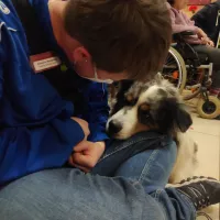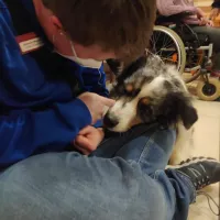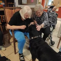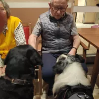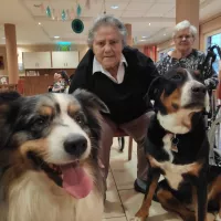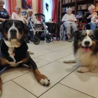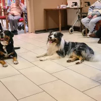 Unsere Bewohner- / Innen konnten an diesem Nachmittag ausgiebig mit den Hunden Charly und Kia kuscheln, sie streicheln und mit ihnen spielen.