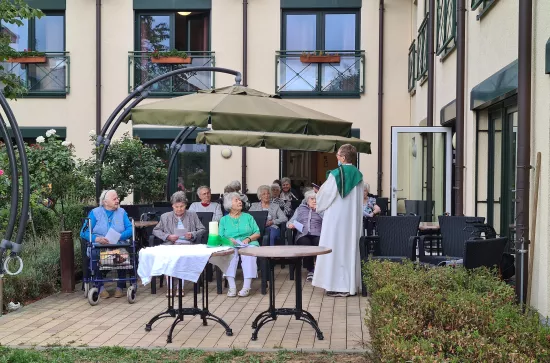 Katholischer Open-Air-Gottesdienst Am 28.08.2020 fand der 1. Open-Air-Gottesdienst in der DOREAFAMILIE Flörsheim statt. Seelsorgerin Frau Monika Dittmann lud zum Katholischen Gottesdienst in den Garten ein und trotz des Windes folgten viele unserer Bewohner / Innen ihrer Einladung. Zurück