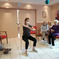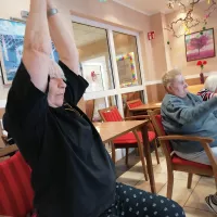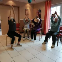 Unsere Ergotherapeutin Frau Tanja Preuss und unsere Fachkraft in der Betreuung Frau Anne Klopfleisch leiteten unsere Bewohner- / Innen beim Yoga im Sitzen an.