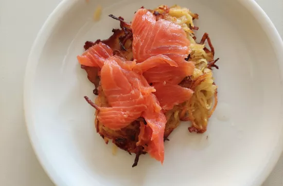 Selbstgemachte Kartoffelrösti mit Lachs. "Guten Appetit"