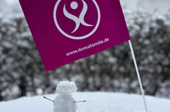 Mitten im leisen Winterzauber von Hattersheim steht ein kleiner Schneemann im frischen Schnee. Zart gebaut, mit winzigen Ärmchen aus Zweigen, wirkt er fast so, als würde er jeden Moment zum Leben erwachen. Neben ihm weht stolz die Fahne der DOREAFAMILIE Hattersheim – ein Zeichen von Gemeinschaft, Geborgenheit und Zusammenhalt, selbst an kalten Tagen.