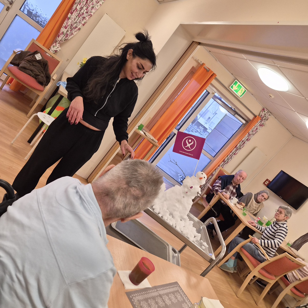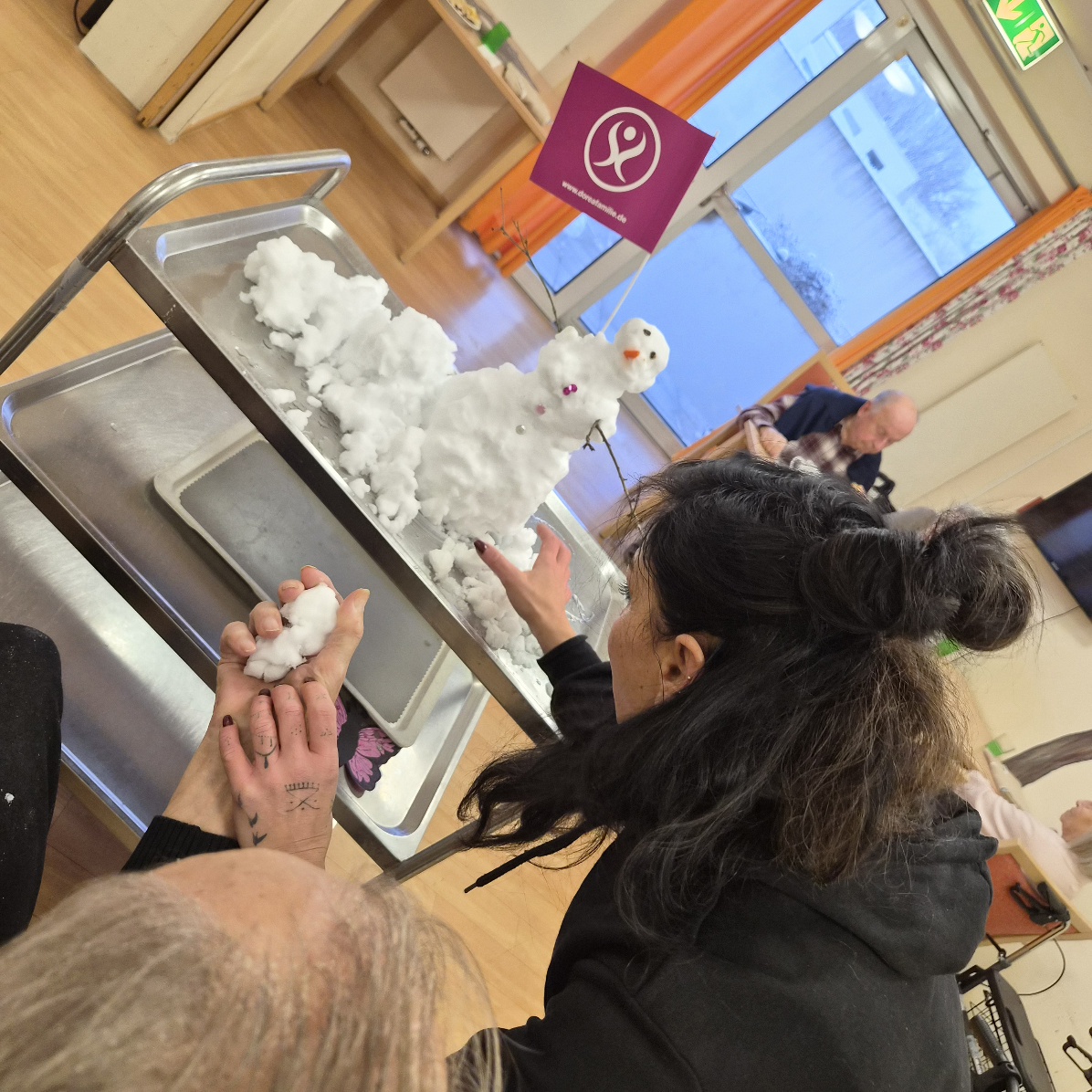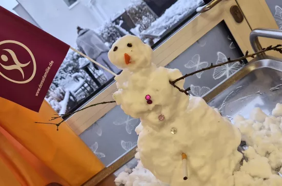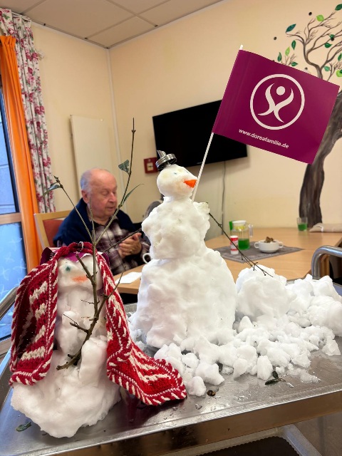 An einem stillen Wintertag, als feine Schneeflocken die DOREAFAMILIE Hattersheim in ein weißes Kleid hüllten, entstand etwas ganz Besonderes. Gemeinsam mit den Bewohnerinnen und Bewohnern wurde gelacht, erzählt und fleißig gearbeitet: Ein Schneemann nahm langsam Gestalt an. Aber wir bauten ihn drinnen. Keiner mußte frieren , aber jeder hatte Spaß und Freude. Bestaunt wurde das fertige Resultat und voller Stolz präsentiert. Ein jeder genoss das Gefühl wieder mal Schnee zu fühlen. Im Rhein Main Gebiet ein zu seltenes Schauspiel. Tolle Momente in der Familie .