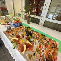 … der Osterhase zu Gast heute in Hattersheim und brachte ein leckeres kulinarisches Frühstück mit . Mit Räucherlachs und Forellenfilet , Garnelen und Seranoschinken , mit Honigmelone und Schinken / Spargelröllchen , von unseren Bewohnern selbst gebackenen Muffins , das ganze mit prickelnden Sekt zum anstoßen , so macht das Leben Spaß, der gelungene Start in das Osterwochenende ….