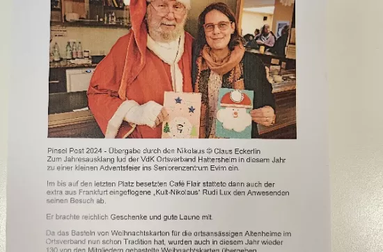 Der Weihnachtsmann beim.VDK Ortsverband Hattersheim überreichte uns in diesem Jahr für alle unsere Bewohner selbstgebastelte Weihnachtskarten . Voller Freude über diese so schöne und menschliche Geste danken wir alle im Namen des gesamten Hauses den fleißigen Mitgliedern des VDKs . Danke
