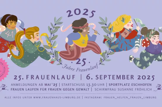 25. Frauenlauf Limburg 05.09.2025 Am 06.09.2025 findet bereits zum 25. Mal der Lauf "Frauen laufen für Frauen - gegen Gewalt" statt. Die Gelder kommen dem Frauenhaus Limburg zugute. Ausrichter ist der Förderverein des Frauenhauses. Zurück