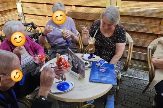 Ausflug in die Eisdiele am 1.Mai 01.05.2024 Bei schönstem Sonnenschein haben wir die Eisdiele in Linter besucht. Die Bewohner:innen haben über die großen Eisbecher gestaunt. Auf der Rückfahrt haben alle vom leckeren Eis geschwärmt. Zurück
