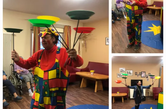 Clown Klinki zu Besuch 02.12.2024 Lachmuskeln und Geschick waren beim Besuch von Clown Klinki gefordert. Bewohner:innen sowie Betreuungskräfte wurden bei allen Darbietungen eingebunden. Es war ein erlebnisreicher, lustiger und besonderer Nachmittag. Zurück