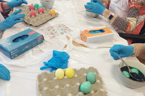 Die Ostervorbereitungen sind im vollem Gange... 23.03.2026 Die Osterzeit rückt immer näher und deshalb stand nun das alljährliche Ostereier färben auf dem Betreuungsplan. Die Bewohner waren am Ende mit ihrer Arbeit sehr zufrieden. Zurück