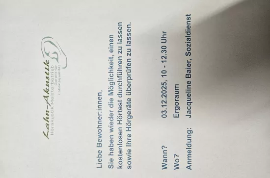 Lahn-Akustik 24.11.2025 Am 03.12.2025 kommt unserer Kooperationspartner Lahn-Akustik zum kostenlosen Hörtest und Hörgeräte-Check in die Einrichtung. Wir freuen uns auf zahlreiche Anmeldungen. Zurück