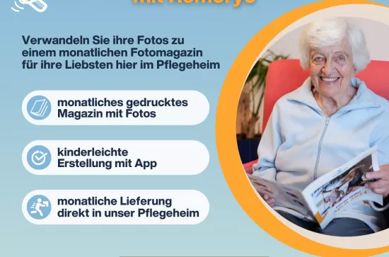Wir freuen uns, Ihnen unsere neue Partnerschaft mit Remoryo vorzustellen! Mit der Remoryo-App können Sie kinderleicht jeden Monat ein gedrucktes Fotomagazin erstellen. Einfach Fotos hochladen – den Rest übernimmt Remoryo. Das gedruckte Magazin wird jeden Monat direkt zu Ihren Angehörigen in unsere Einrichtung geliefert.