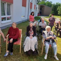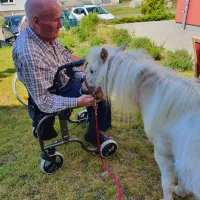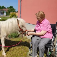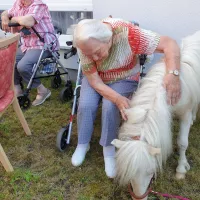 Zu Beginn hat Frau Schulz den Bewohnern ein paar Dinge über das Pony und Pferde im Allgemeinen erzählt. Im Anschluss durften die Damen und Herren Giotto mit Äpfeln, Möhren und Hafer füttern. Der ein oder andere hat das Pony gestriegelt oder gestreichelt. Unseren Bewohnern hat dieser besondere Besuch sichtlich Freude bereitet und für eine lebhafte Abwechslung gesorgt.