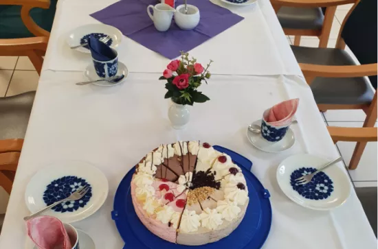 Zur Kaffeezeit wird den Bewohnerinnen und Bewohnern unseres Hauses bei einer Tasse Kaffee oder Tee und einem Stück Torte die Möglichkeit des wohnbereichsübergreifenden Austausches geboten. In gemütlicher Runde werden Gespräche zu den unterschiedlichsten Themen geführt, bestehende Kontakte unter den Bewohnerinnen und Bewohnern aufrechterhalten sowie das Knüpfen neuer Kontakte unterstützt.