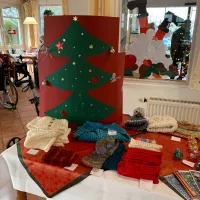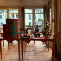 Wie bereits im vergangenen Jahr wurden zum Kaffee und Tee Glühwein und warmer Kakao mit Sahne ausgeschenkt sowie Lebkuchen und von der Backgruppe des Hauses selbst hergestellter Stollen serviert. Ein Verkaufsstand mit liebevoller Handarbeit hergestellten Basteleien und selbstgebackenen Leckereien lud zum Stöbern ein.