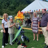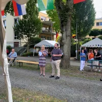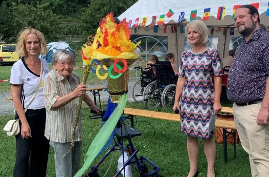 Unsere älteste Bewohnerin Frau Bender eröffnete das Olympische Sommerfest der DOREAFAMILIE RUNKEL 2024 im Beisein von Bürgermeister Michel Kremer und Vermieter Herrn Egenolf.