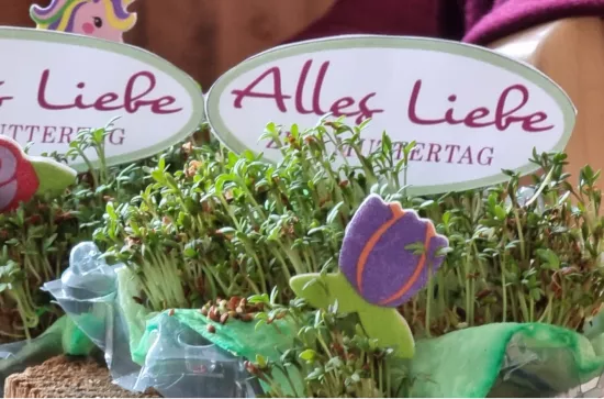 Muttertag bei uns in der Familie ♥ Zum Muttertag gab es vom Sozialen Dienst für alle Mütter im Haus was ganz besonderes. Selbstgepflanzte Kresse und von dem Küchen Team einen leckeren Muffin. Zurück