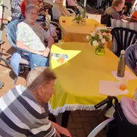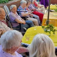 Dieser Mittwochnachmittag wird unseren Bewohnerinnen und Bewohnern noch lange in Erinnerung bleiben. Bei herrlichem Sonnenschein und sommerlichen Temperaturen traf man sich in großer Runde auf der Terrasse.
