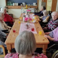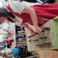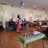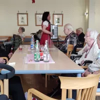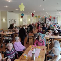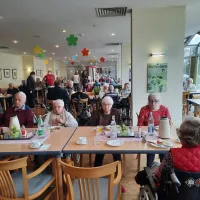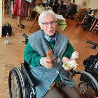 So saßen unsere Bewohnerinnen und Bewohner (BW) zur Kaffezeit gemütlich im Hausrestaurant, während vor der Tür der sprichwörtliche April tat, was er wollte. Im Foyer waren verschieden Stände mit Schmuck, kunstvollen Holzprodukten und Näh- und Handarbeiten. Unterhalten wurden die BW auf wundervolle Art von der Harzer Jodelmeisterin Marina Hein, die empathisch und stimmungsvoll die gute Laune befeuerte. Und dann war auch noch das Wetter soweit gnädig, dass unsere stellv. Küchenleitung B. Allerkamp Bratwurst für alle BW und die helfenden Hände grillte!