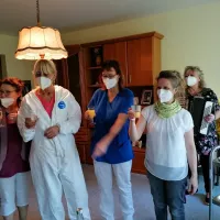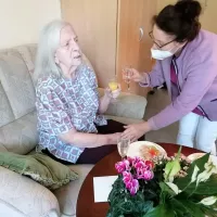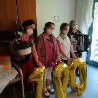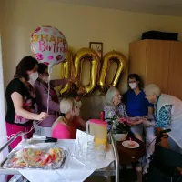 Einen 100. Geburtstag erleben wir in unserer Einrichtung auch nicht regelmäßig! Umso schöner war es, dass wir unserer Bewohnerin Frau Sch. zu diesem besonderen Wiegenfeste gratulieren konnten. Unsere Mitarbeiter der Pflege und des Begleitenden Dienstes überraschten Sie mit einem Ständchen und bunten Ballons. Das Ständchen begleitete unsere Mitarbeiterin Frau Gerbrich auf ihrem Akkordeon. Gemeinsam wurde mit einem Gläschen Sekt angestoßen. Dazu gab es leckere Schnittchen aus unserer Küche. Frau Sch. verbrachte einen schönen Tag mit ihrer Familie.