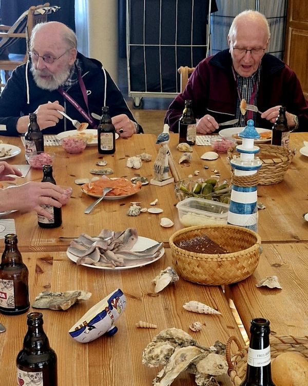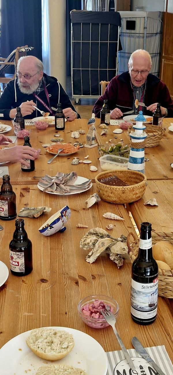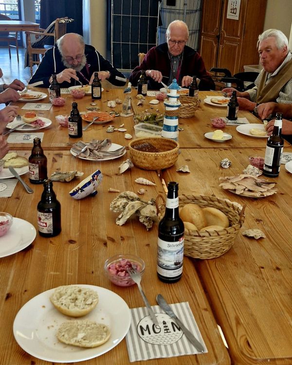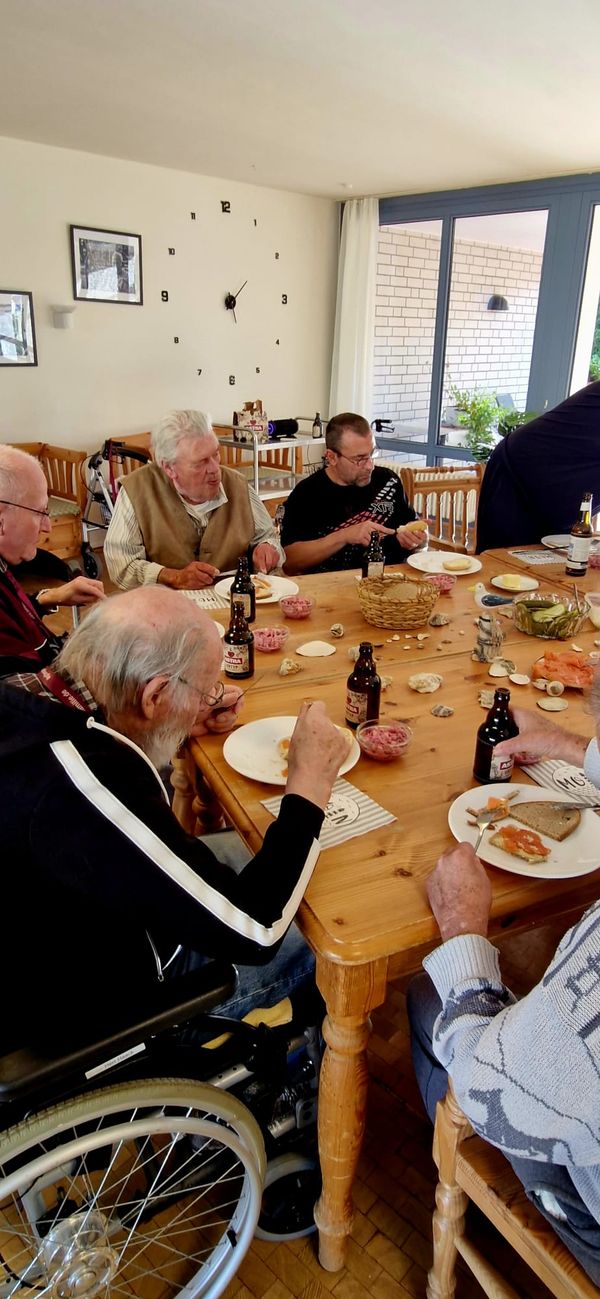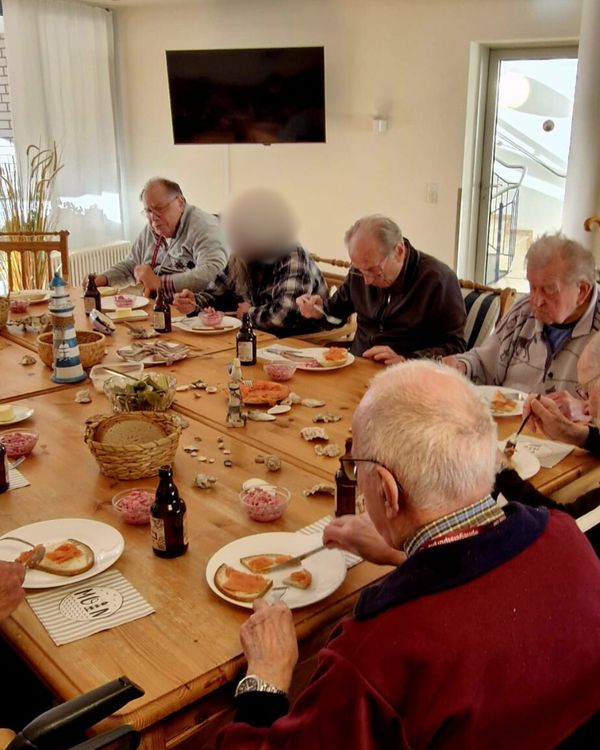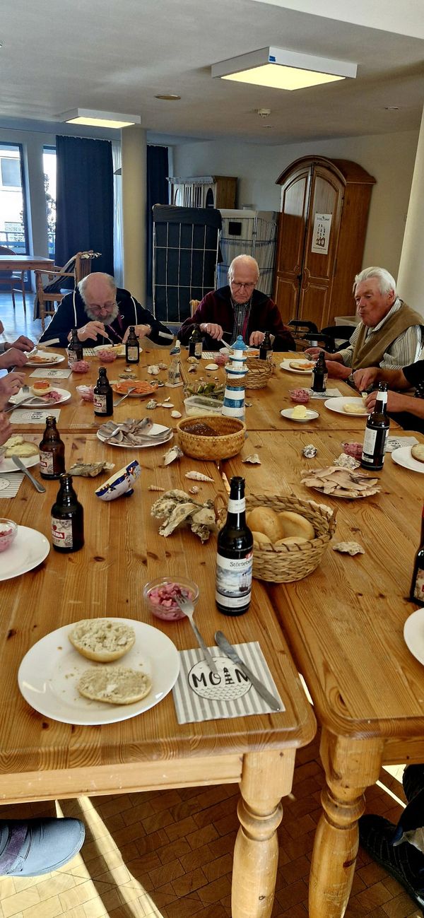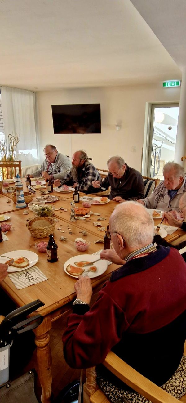 Für den Männerstammtisch im September hatte Herr Kowalski vom Begleitenden Dienst einen deftigen norddeutschen Abend geplant. Am maritim gedeckten Tisch versammelten sich unsere Herren und genossen unter anderem Lachs, Matjes und Heringssalat mit frischen Brötchen. Dazu gab es ein kühles Bier. Die Bewohner genossen in gemütlicher Runde die nordischen Leckereien.