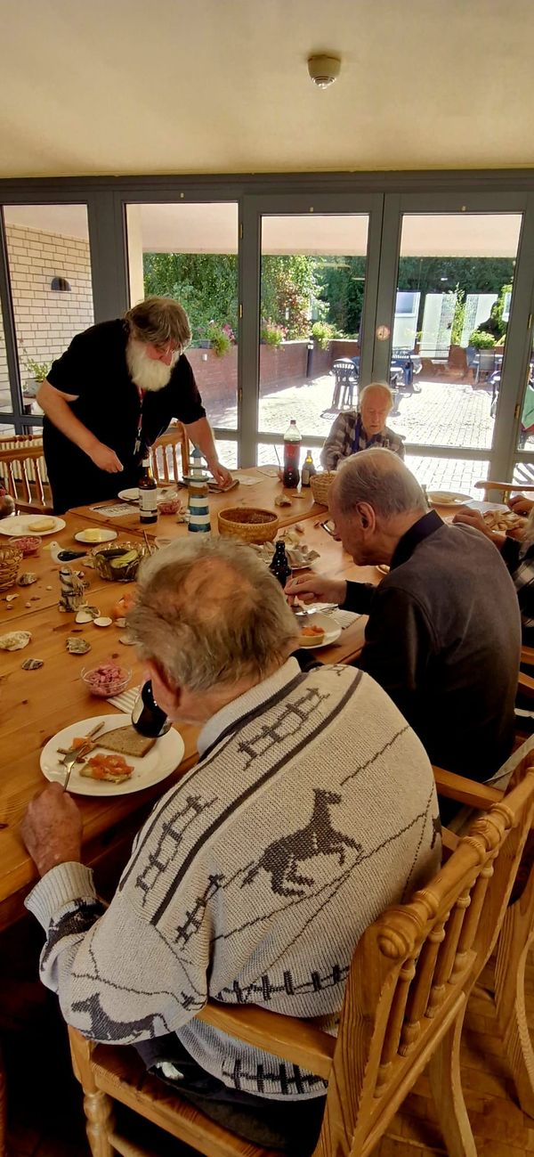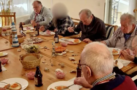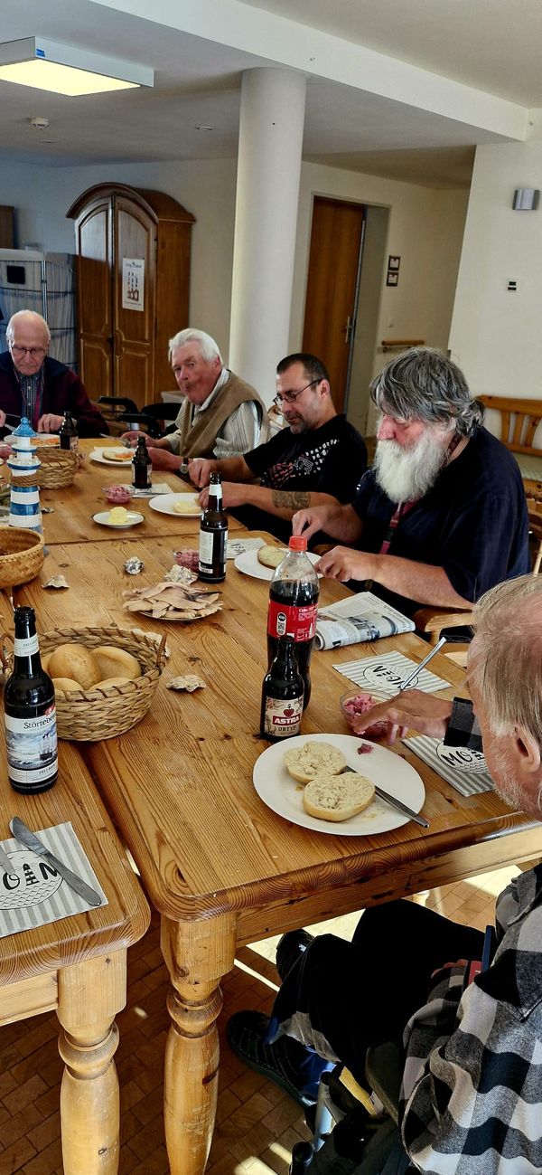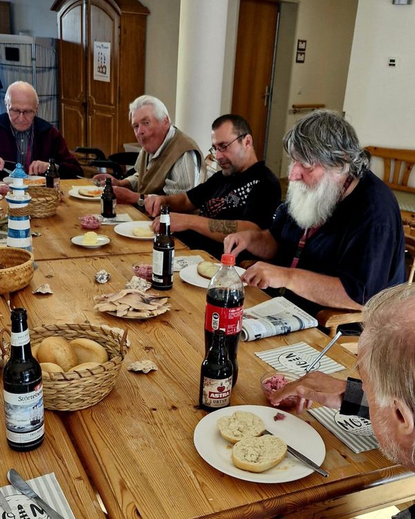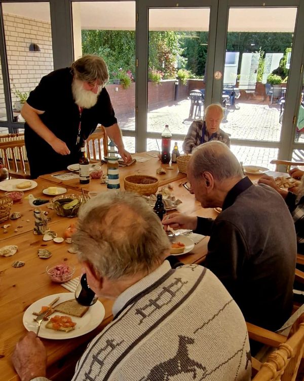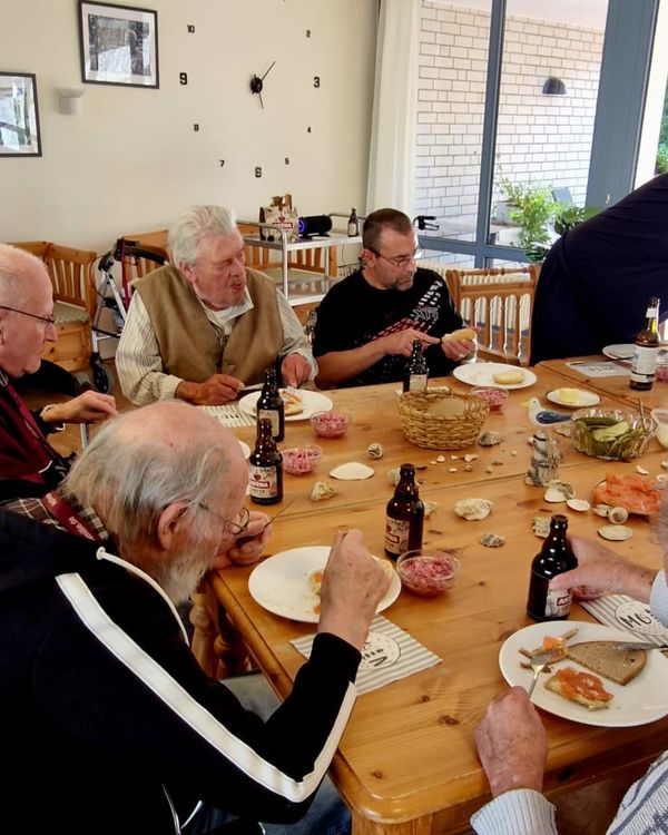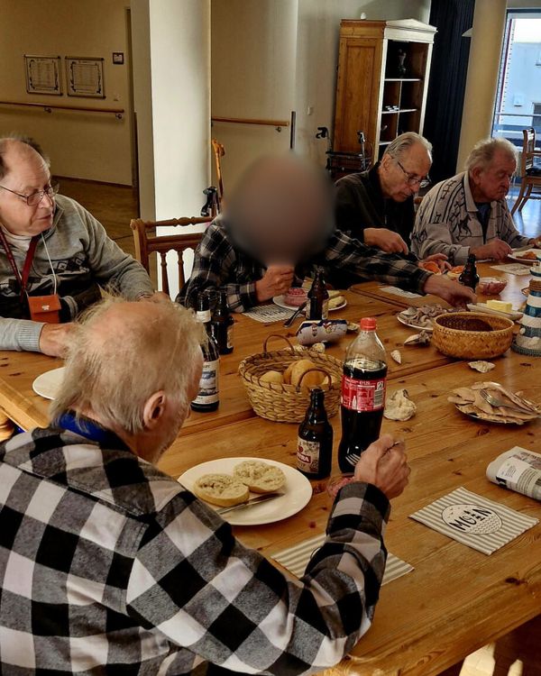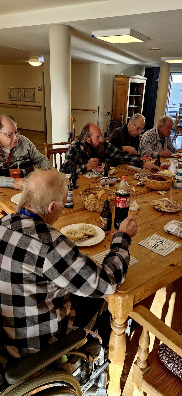 Für den Männerstammtisch im September hatte Herr Kowalski vom Begleitenden Dienst einen deftigen norddeutschen Abend geplant. Am maritim gedeckten Tisch versammelten sich unsere Herren und genossen unter anderem Lachs, Matjes und Heringssalat mit frischen Brötchen. Dazu gab es ein kühles Bier. Die Bewohner genossen in gemütlicher Runde die nordischen Leckereien.