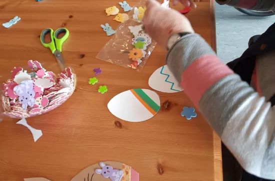 Das Osterfest wirft bereits seine Schatten voraus und so wurde mit den Osterbasteleien für die Dekoration der Bewohnerzimmer, aber auch der Gemeinschaftsräume begonnen. Mit großen Eifer waren die Bewohnerinnen und Bewohner dabei zu zeichnen, zu schneiden und zu kleben. Mit viel Liebe entstanden niedliche Osterhasen und Ostereier aus Pappe.
