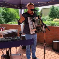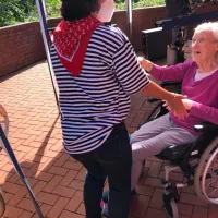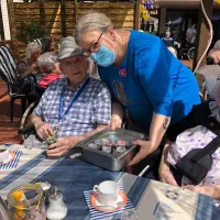 Der begleitende Dienst bereitete den Ablauf und die Fest -Dekoration vor, die Küchenleitung sorgte für das Essen und die Haustechniker kümmerten sich um Zelte, Pavillons und reichlich Sitzgelegenheiten. Und dann ging es am frühen Nachmittag bei gutem Wetter endlich los. Hand in Hand mit dem Pflegepersonal wurden die Bewohnerinnen und Bewohner zur Terrasse und in den Garten begleitet, wo schon eine herrliche Kaffeezeit bereitet war. Damit war auch das "Festprogramm" gestartet. Frau Kreth, die Einrichtungsleitung, eröffnete mit einer kurzen Begrüßungsrede das Sommerfest 2021. Dann wurde schnabuliert, geschlemmt, getanzt, gesungen, gelacht... gefeiert!