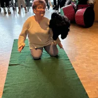 Unsere begeisterten Bewohnerinnen und Bewohner wurden von Frau Gaßmann aktiv in das Programm miteinbezogen. So konnten sie ihre Sportlichkeit beim Bewegen eines Schwungtuches unter Beweis stellen. Dabei wurden Häppchen für die Hunde durch ein Loch geschüttelt, die von den eifrigen Vierbeinern aufgefangen werden mussten. Die Hunde. die während der Darbietung pausierten, wurden von unseren Bewohnerinnen und Bewohnern mit jeder Menge Streicheleinheiten verwöhnt.